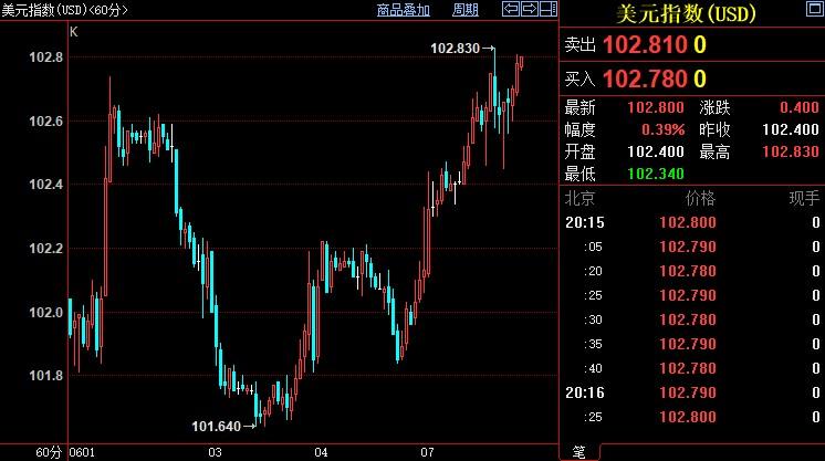 北京时间20:16,现货黄金上涨0.38%至1848.38美元/盎司;COMEX期金主力合约上涨0.40%至1851.2美元/盎司;美元指数上涨0.38%至102.79。
