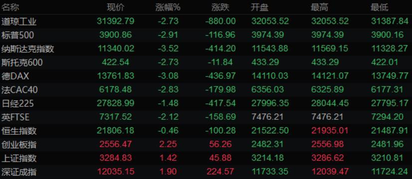 美股收盘情况:标普500指数跌2.9%;全周下跌超过5%;道琼斯指数下跌2.7%,全周跌4.6%;纳斯达克综合指数下跌3.5%,全周下跌5.6%;纳斯达克100指数下跌3.6%,全周下跌5.7%;罗素2000指数下跌2.7%,全周跌4.4%。