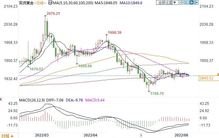 北京时间6月10日14:03 现货黄金报 1845.52美元/盎司