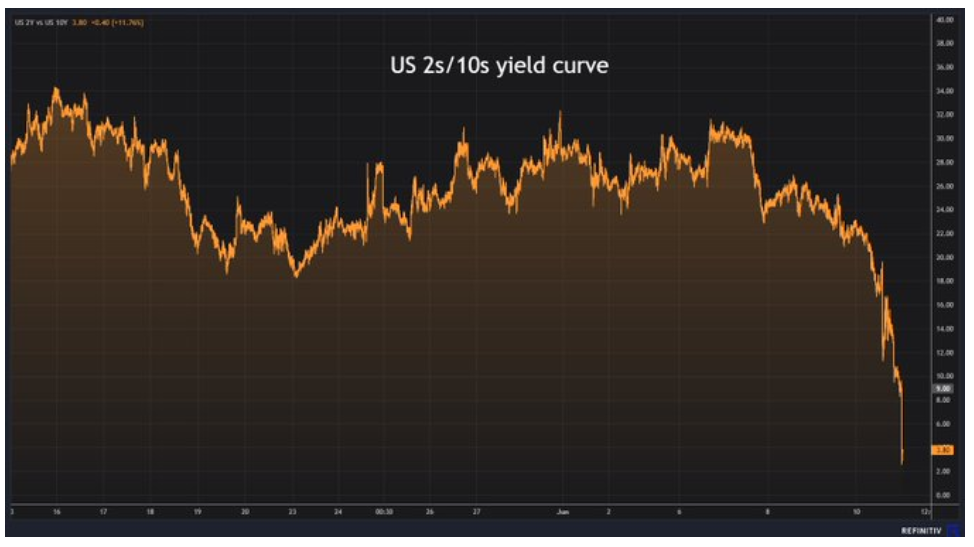 作为经济衰退前瞻指标的美债收益率曲线倒挂局面则开始重新出现——2年期和10年期国债收益率之差在周一早盘已缩小至不到5个基点。5年期和30年期国债收益率之差在上周五则已跌破零,为5月4日以来首次倒挂。MKM Partners首席经济学家Michael Darda在彭博电视上表示,“我们正在面对滞胀环境,美联储仍然落后于形势。”