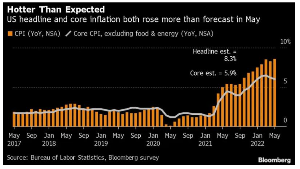 美国劳工部上周五发布的报告显示,5月份美国消费者价格同比上涨8.6%,远超预期的同时进一步刷新了40年来的最高纪录,这一数据也彻底打破了白宫有关决策者管住了美国人生活成本飙升的说法。不含食品和能源的核心消费者价格同比上涨6%,环比上涨0.6%,同样高于预期。