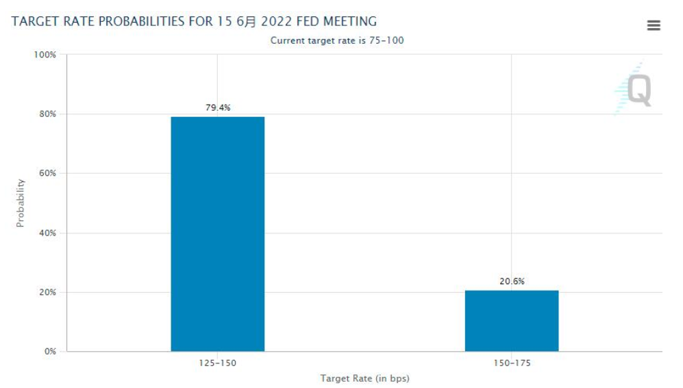 根据芝商所的美联储观察(Fed watch)工具显示,联邦基金期货交易员目前认为美联储6月份加息75个基点的可能性约为23.6%,高于上周四的3.6%。