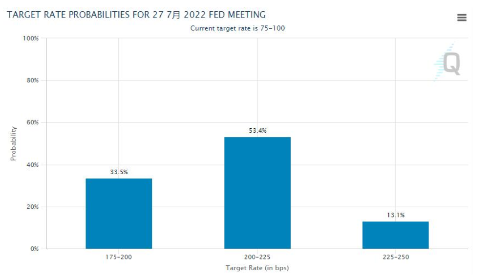 而由于6月直接加息75个基点可能过于突然,目前更多的市场预期集中在了7月美联储可能加码之上。美联储观察工具显示,美联储在7月议息过后将利率上调至2.00%-2.25%区间的几率为53.4%(未来两次会议累计加息125个基点);上调至2.25%-2.50%区间的几率为13.1%(未来两次会议累计加息150个基点)。