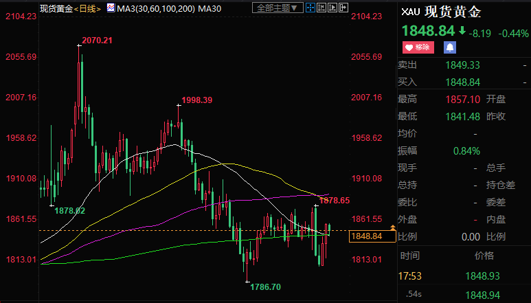 北京时间17:49,现货黄金下跌1.20%至1849.02美元/盎司;美元指数上涨0.21%至104.407。