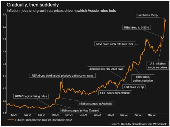 澳洲联储目前基准的现金利率为0.85%,但激进的市场定价已经为明年初该联储加息至4%做好了准备,尽管眼下澳洲联储自身对利率峰值的指引仅在2.5%左右。相比于许多主要央行一年只有8次利率决议,澳洲联储一年的议息会议次数多达11次,而利率市场眼下已预计其年内余下的6次会议每次都可能加息50个基点。