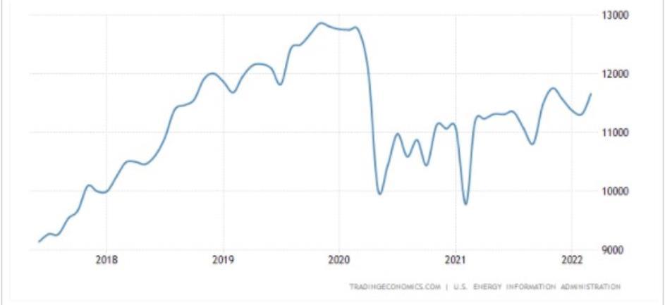 从上图看,美国在2020年开始由于疫情,原油产量大幅下降,一直到最近都仍在一个不算高的产量上波动。