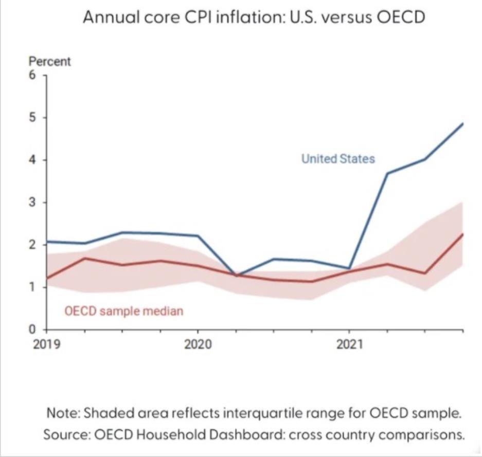 但根据美国旧金山联邦储备银行的一篇文章,比较美国与相似发达经济体的核心通胀率,作者们发现在2021年前,美国的核心通胀率与另外八个国家(英法德、加拿大、荷兰、挪威、瑞典和芬兰)相比并没有显著差异;但在2021年之后,美国的核心通胀率急速飙高。