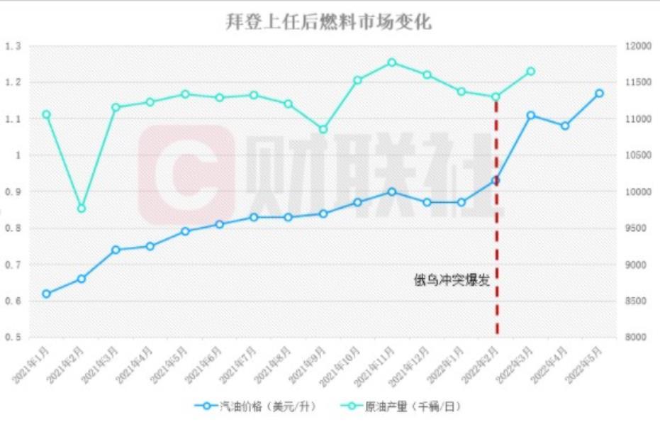 如果只看拜登任期内的原油产量,美国原油市场被压制的事实会更加明显。可以看到从2021年1月到2022年3月,美国原油的日产量曲线更近似一条水平线,而相对的,原油下游产品汽油价格却在一路走高,并在俄乌之后迎来了陡峭的上升。