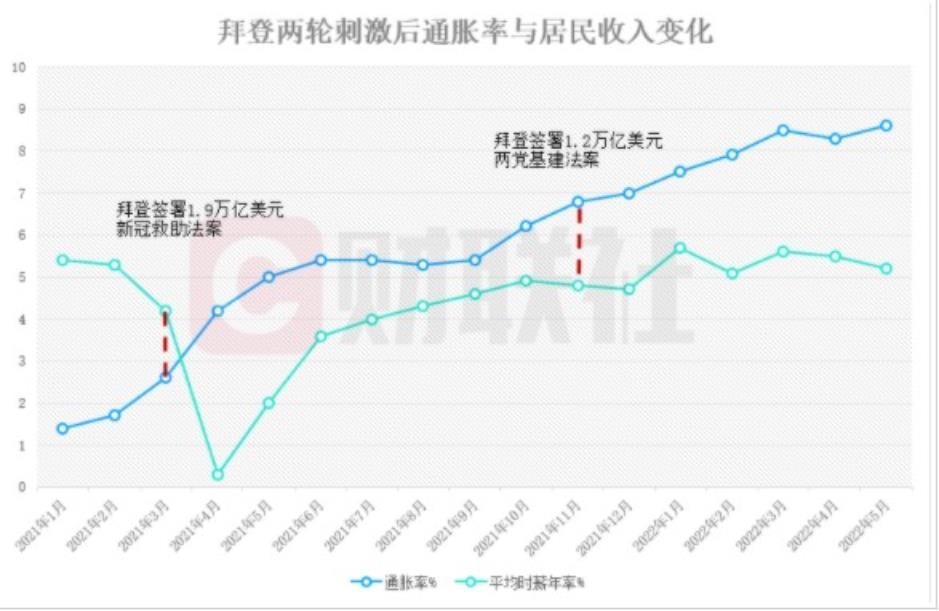 从数据来看,拜登在2021年3月和11月分别通过了新冠救助法案和两党基建法案,预算规模分别为1.9万亿美元和1.2万亿美元。在法案生效之后的几个月中,美国的通胀率都出现了明显的爬升。