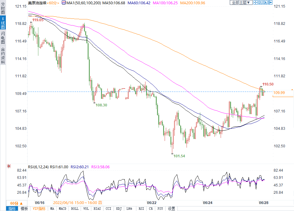 周一(6月27日)布油期货上涨1.7%,结算价报每桶115.09美元。两个供应国警告称可能因为政治动荡而下调产量,供应前景更加紧张;G7正在考虑对俄罗斯原油实施价格上限,以切断俄罗斯战争资金的来源,投资者密切关注七国集团(G7)领导人会议进展。