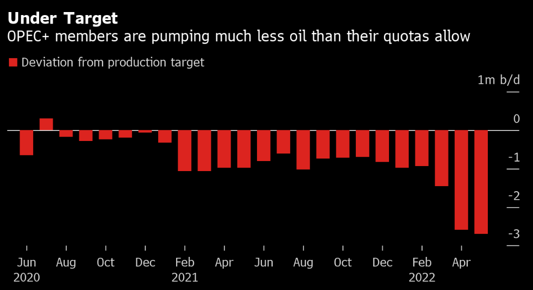 OPEC+产油国联盟向全球市场供应的石油比其承诺的水平低了超过5亿桶,加剧了对该组织平衡全球市场能力的担忧。在2020年5月,石油输出国组织(OPEC)与盟友联手协调减产,以重新平衡全球石油市场。根据该组织联合技术委员会的数据,自那以来,OPEC+的累计产量比协议规定的水平少5.62亿桶。OPEC+对减产协议的履约率在5月份飙升至256%,因为成员国日产量比其该组织的集体目标低270万桶。