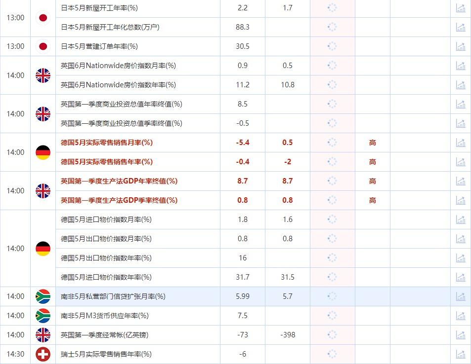 14:00 英国第一季度生产法GDP年率终值(%) , 前值 8.7 , 预期值 8.7 , 公布值:待发布