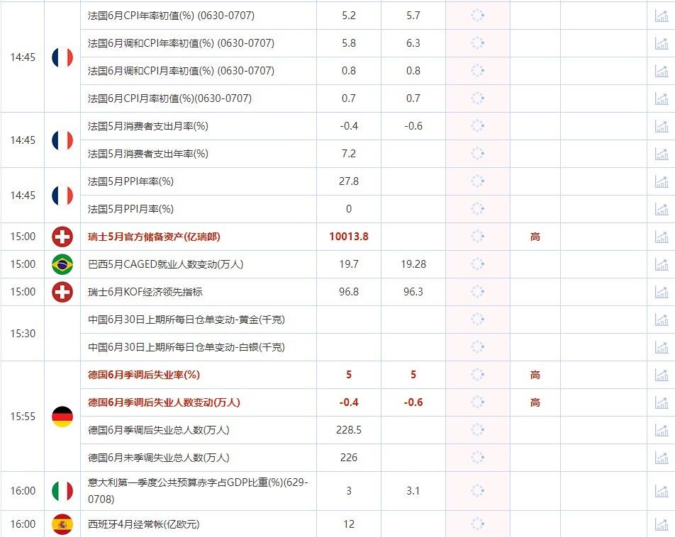 14:45 法国6月调和CPI年率初值(%) (0630-0707) , 前值 5.8 , 预期值 6.3 , 公布值:待发布