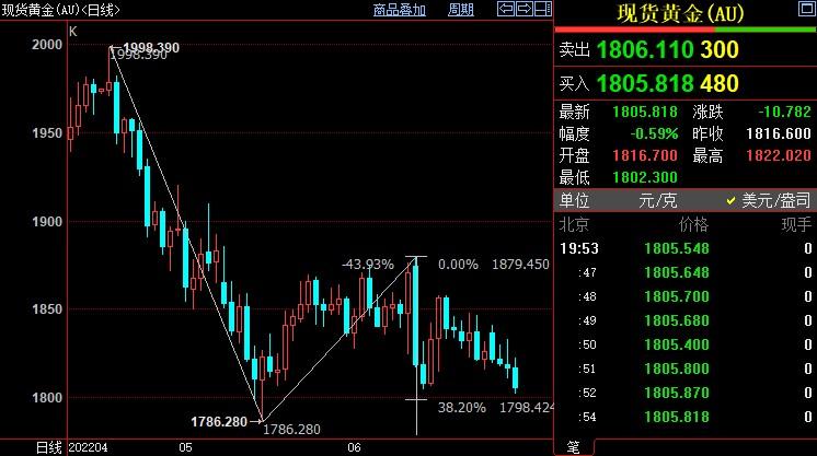北京时间20:06,现货黄金下跌0.67%至1805.56美元/盎司;COMEX期金主力合约下跌0.61%至1806.4美元/盎司;美元指数上涨0.30%至105.421。