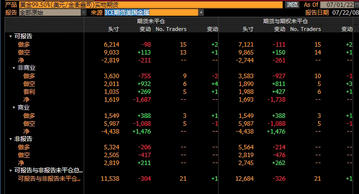 美国商品期货交易委员会(CFTC)数据显示,截至6月28日当周,COMEX黄金期货投机性净多头寸减少15180手至46637手,创近9个月以来新低;其中多头仓位减少3532手合约至121681手,空头仓位增加11647手至75044手合约。