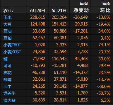 下图:截至6月28日当周,对冲基金大宗商品净多头头寸变动(来源:CFTC)