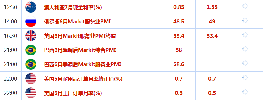 12:30澳洲联储公布利率决议;17:30 英国央行公布7月金融稳定报告;18:30 OPEC秘书长巴尔金都在尼日利亚油气会议上发表讲话。