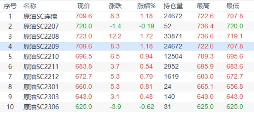 周二(7月5日)上海原油价格收盘小幅上涨8.3元,跌幅1.18%。主力合约2209终盘收于709.6元/桶,涨8.3元/桶。油价收涨,主要因有消息显示,挪威近海油气田工人罢工,这个油价短期走势带来了一些支持。另外,全球原油供给有限,始终长期给油价带来支持。