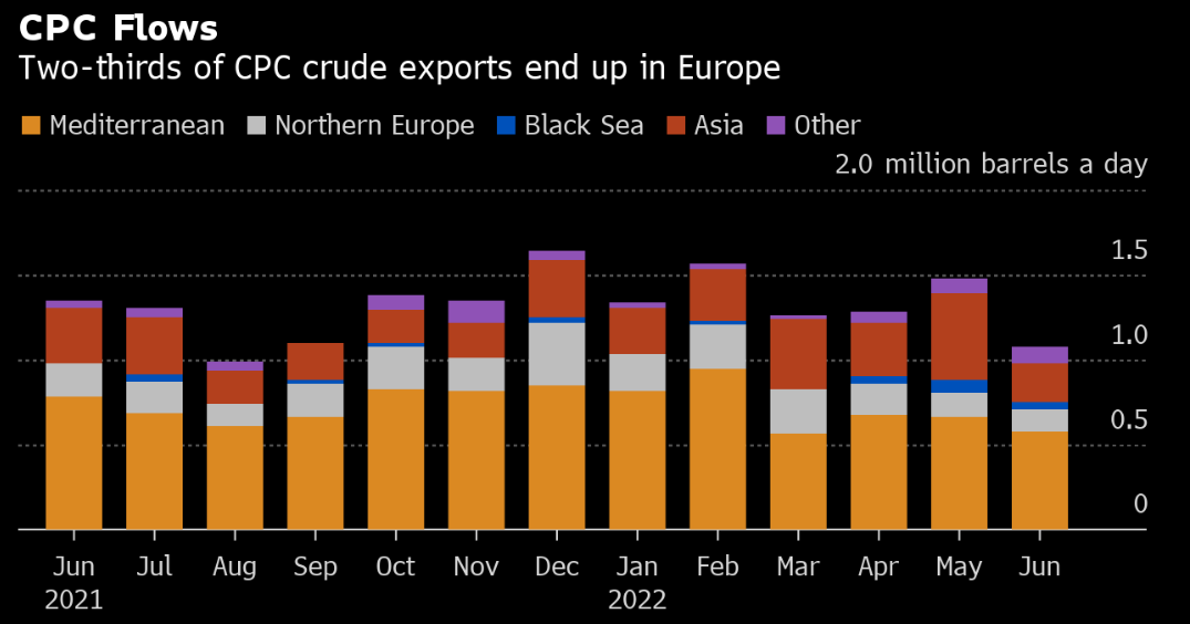 但是,如果每天最高损失100万桶轻质低硫原油供应,对欧洲将构成沉重打击。暂停CPC的输送,即使持续时间不长,俄罗斯也能通过刺激本已高企的油价来惩罚西方的对手,同时还能提高其财政收入,因为其出口几乎不受影响。