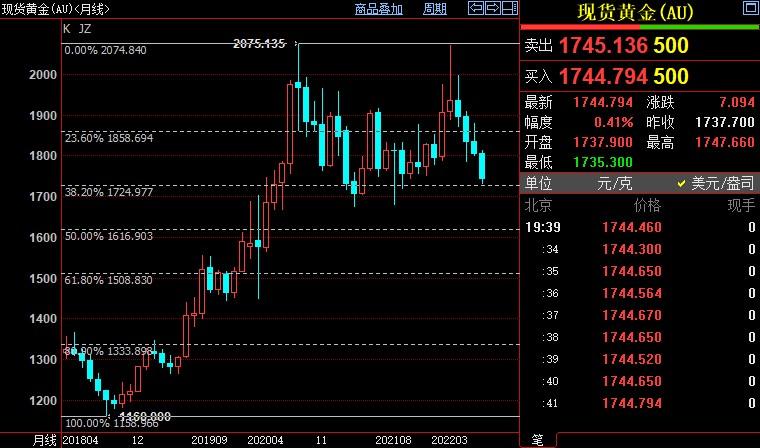 北京时间19:42,现货黄金上涨0.36%至1744.86美元/盎司;COMEX期金主力合约上涨0.41%至1743.6美元/盎司;美元指数下跌0.16%至106.908。