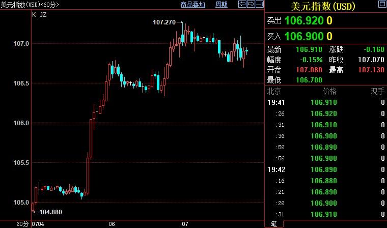 美元指数隔夜创下2002年12月初以来新高107.2846,受到全球增长担忧、美联储强硬态度和主要非美货币疲软等因素推升。投资者押注,美元未来可能会有进一步上涨。