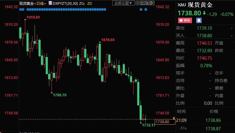 本周,现货黄金价格下跌近4%,盘中创2021年9月初以来新低至1732.17美元/盎司。金价不仅连续第四周下跌,也将创下2021年6月18日当周以来最大单周跌幅。