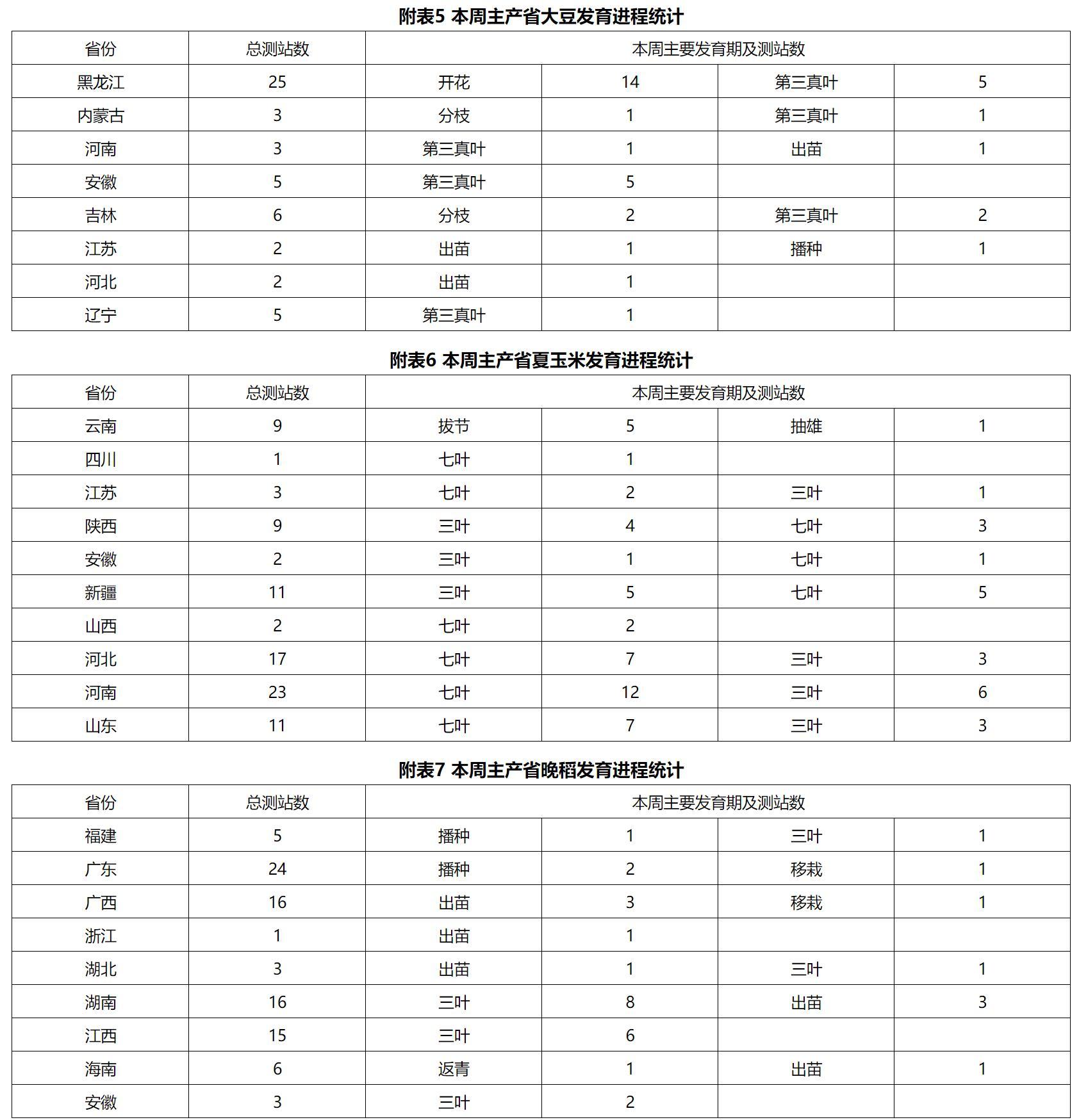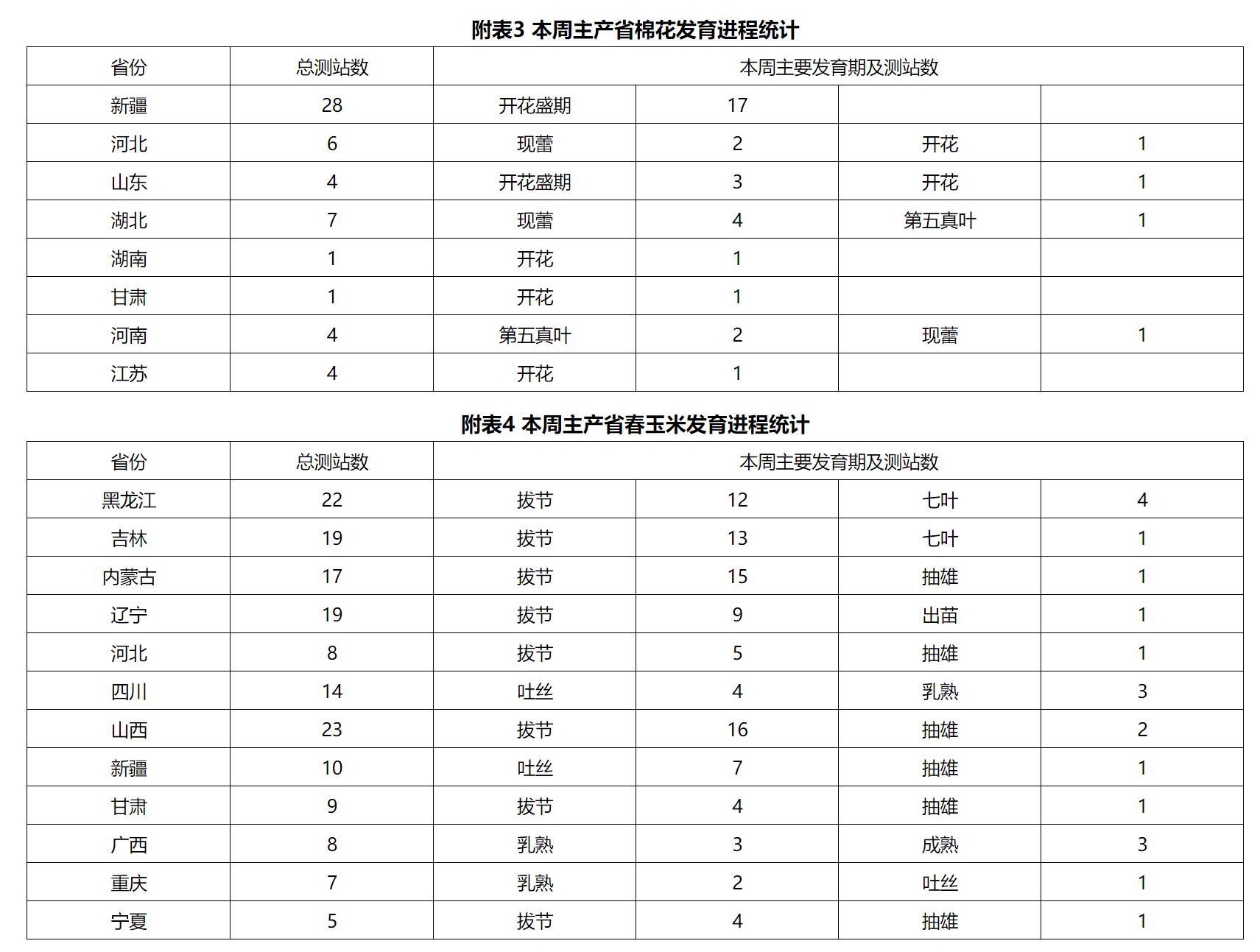 本周,东北地区气温偏高,大部地区降水量有10~150毫米,总体利于作物生长发育;辽宁中东部等地强降水造成部分低洼农田出现渍涝、农作物受淹倒伏以及设施农业受灾。华北和黄淮大部出现降水,其中河北中南部、山西中北部、河南东部、山东中西部等地降水量有25~200毫米,降水利于增加土壤水分,对秋收作物生长发育及果树生长总体有利,但局地短时强降水等强对流天气导致低洼地段出现田间积水,蔬菜等经济作物受灾,部分设施大棚出现棚膜和结构损坏,同时田间湿度较大利于农作物病虫害的发生发展。受3号台风“暹芭”及其减弱后的低压环流与西风槽共同影响,广西、广东、湖南、江西、湖北、苏皖北部等地先后出现大到暴雨,局地大暴雨,强降水不利于早稻抽穗扬花和灌浆结实以及已成熟早稻收获晾晒,同时较大风雨导致果树折枝、落果以及农作物倒伏、折断。西南地区大部光热充足、大部土壤墒情适宜,云南、贵州、重庆降水量有10~50毫米、部分地区50~100毫米,利于水稻、玉米、露地蔬菜和经济林果等生长发育。