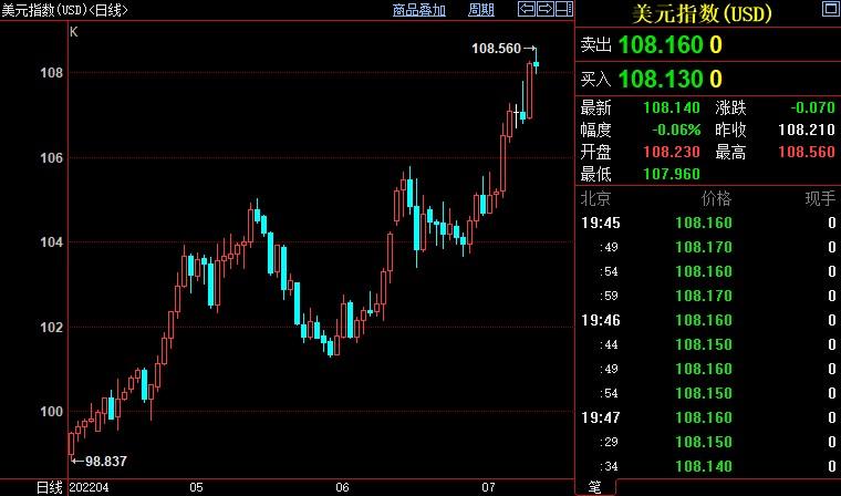 上周公布的美国6月非农就业数据向好,可能开启美元最新一轮涨势。美指隔夜自2002年10月以来首次升破108关口,日内续创近20年新高至108.567。