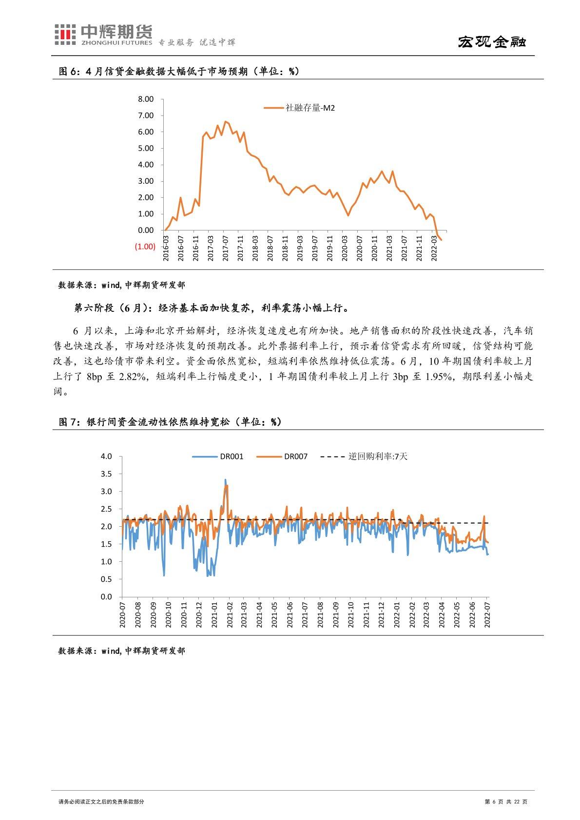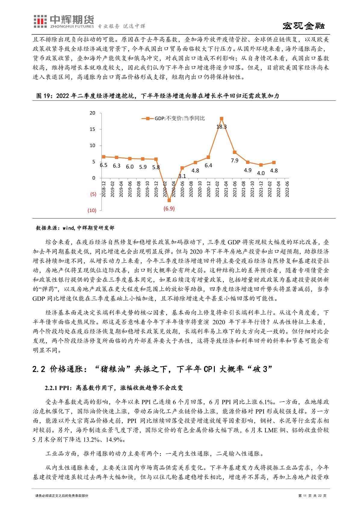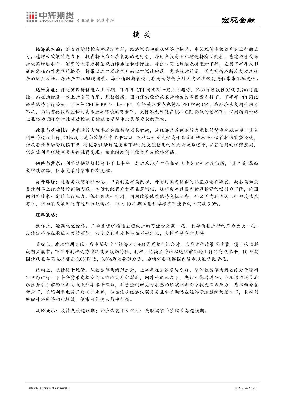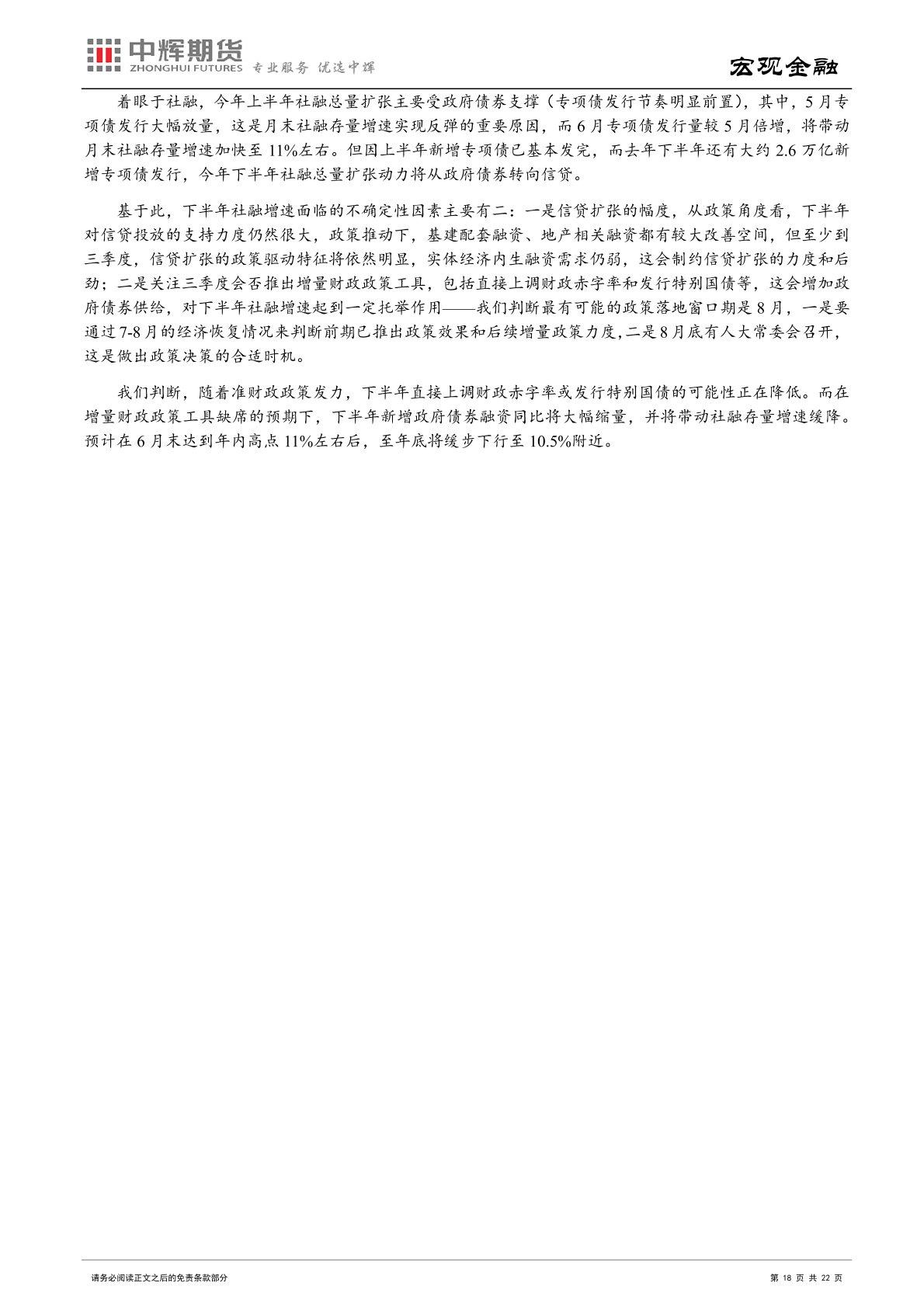 通胀角度:伴随猪肉价格进入上行期,下半年 CPI 同比有一定上行趋势,不排除阶段性突破 3%的可能性。而在油价进一步上升空间有限、基数抬高、国内保供稳价政策持续发力等因素支撑下,下半年 PPI 同比还将保持下行势头。下半年 CPI 和 PPI“一上一下”,市场关注重点也将从 PPI 转向 CPI。在经济修复内生动力不足,仍然需要较为宽松的货币金融环境的背景下,央行不太可能在核心 CPI 仍低的情况下,仅因猪肉价格上涨推动 CPI 暂时性突破控制目标就改变货币政策稳增长的取向。