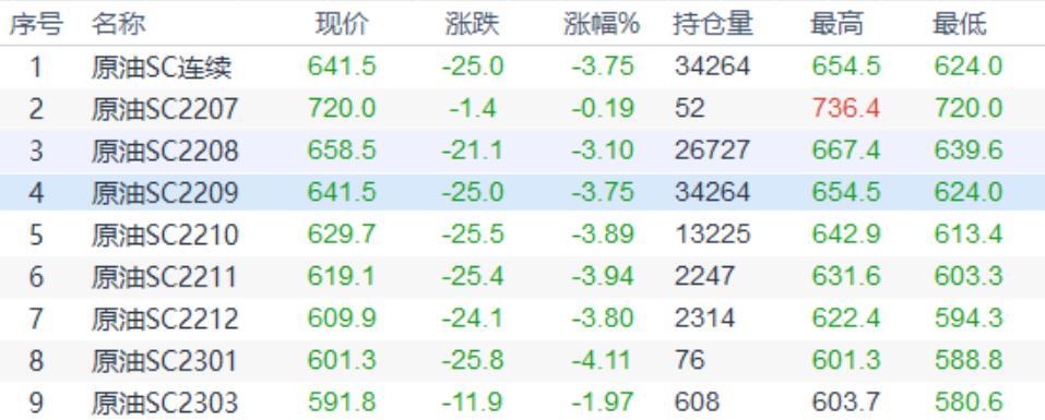 周三(7月13日)上海原油价格收盘下跌25.0元,跌幅3.75%。主力合约2209终盘收于641.5元/桶,跌25.0元/桶。油价收跌,主要因美联储加速收紧政策升温,且全球经济放缓的忧虑加重。