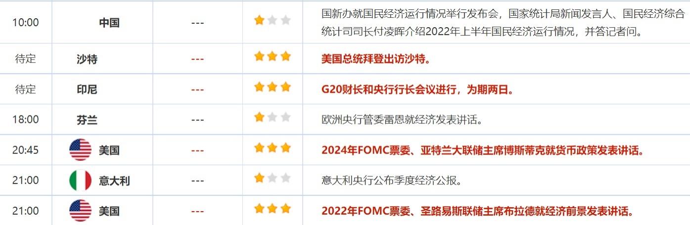 2022年7月15日,全球主要经济体将公布经济数据,需重点关注欧元区5月季调后贸易帐,美国6月零售销售月率,美国6月工业产出月率。大事方面需关注:G20财长和央行行长会议,亚特兰大联储主席博斯蒂克就货币政策发表讲话,圣路易斯联储主席布拉德就经济前景发表讲话。