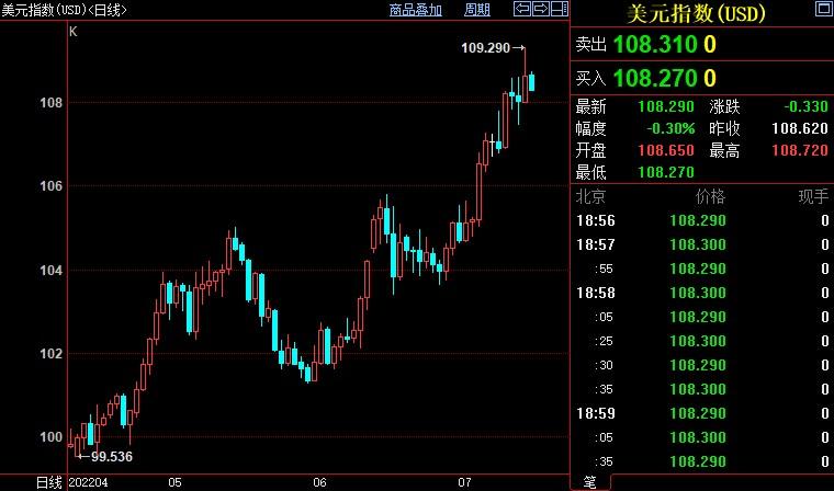 美元指数连续第三周上涨,先后上破108和109两大整数关口,刷新2002年9月中旬以来高点至109.303,因美国整体通胀破九,给美联储大幅加息提供了新的依据。而在全球经济衰退风险加剧之际,美元避险功能也得以彰显。