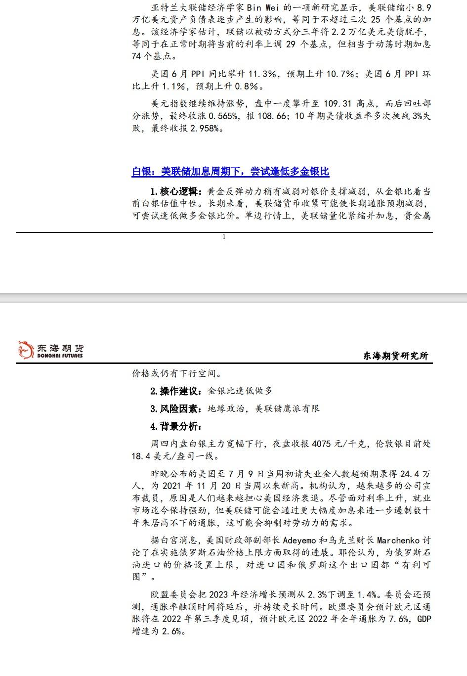 【东海期货7月15日产业链日报】贵金属篇:美国PPI再超预期,金银下行