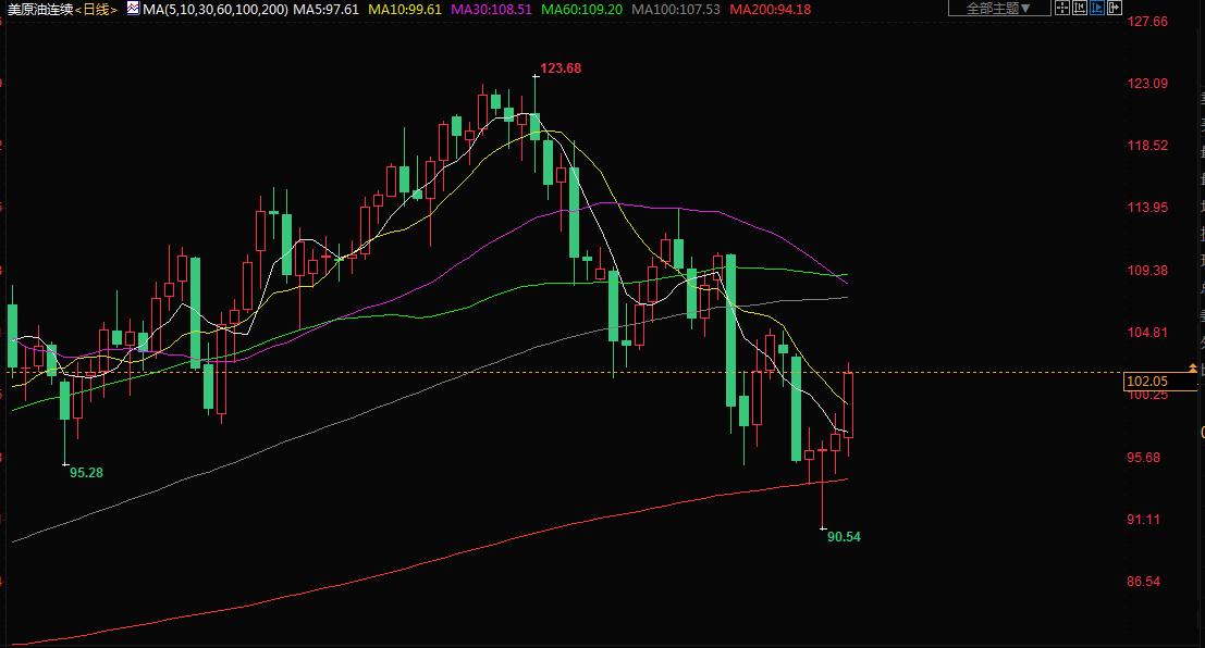 商品收盘方面,9月布伦特原油期货价格上涨5.1%,报收于每桶106.27美元,8月美国原油期货结算价上涨5.1%,报102.60美元;美国期金结算价上涨0.4%,报1710.20美元。