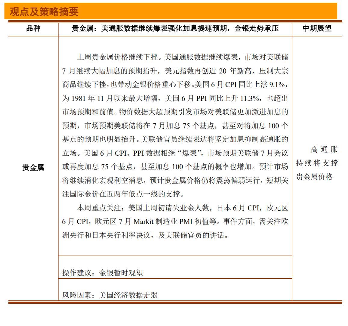 上周贵金属价格继续下挫。美国通胀数据继续爆表,市场对美联储7月继续大幅加息的预期抬升,美元指数再创近 20 年新高,压制大宗商品继续下挫,也带动金银价格重心下移。美国 6 月 CPI 同比上涨 9.1%,为 1981 年 11 月以来最大增幅,美国 6 月 PPI 同比上升 11.3%,也超出市场预期和前物价数据大超预期引发市场对美联储更加激进加息的预期,市场预期美联储将在7月加息75个基点,甚至对将加息100个基点的预期也明显抬升