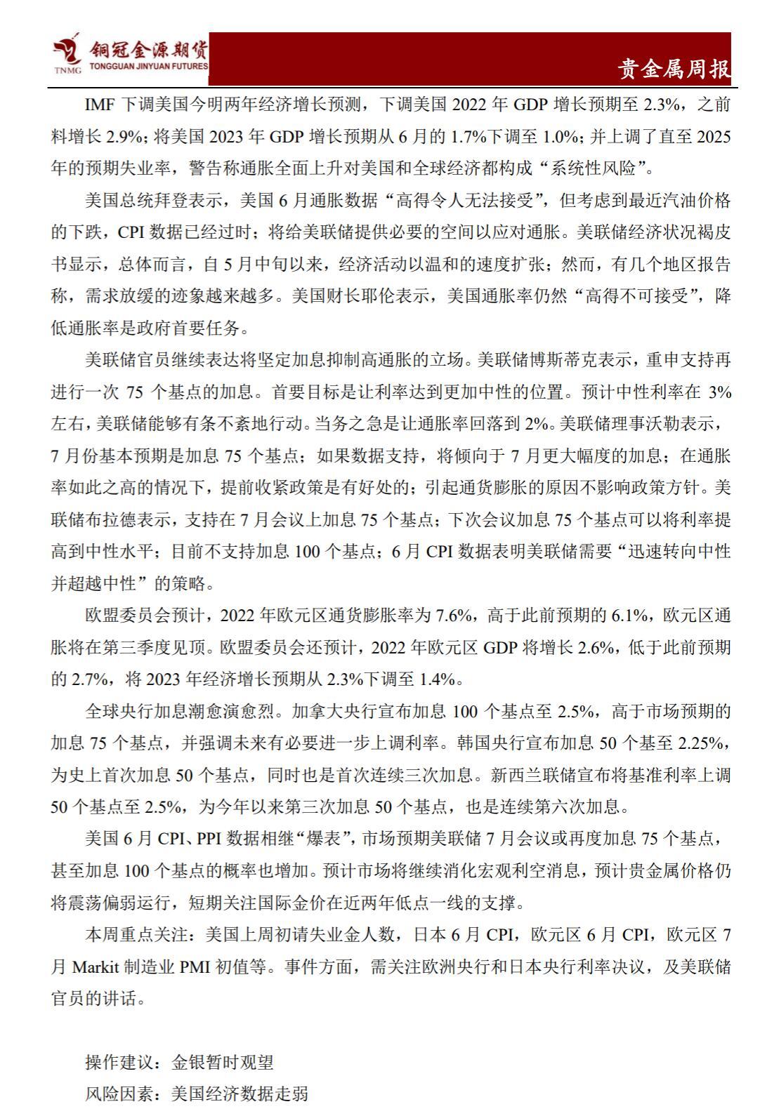 铜冠金源期货贵金属周报20220718:金银走势承压