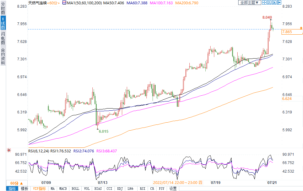 美国天然气尾盘上涨8.28%至7.865美元/百万英热。英国即时交付的批发天然气价格上涨32.6%,达到248便士/撒姆;第二日交付的天然气批发价格上涨26.3%,达到245便士/撒姆;周末交付的天然气批发价格上涨27.7%,至235便士/撒姆。早前德国能源监管机构表示,俄罗斯天然气工业股份公司重新确定了天然气流量,7月21日的流量将为30%,北溪一号的天然气流量可能会有进一步变化。低于此前普京所说的将在检修完成后维持40%的输气量。