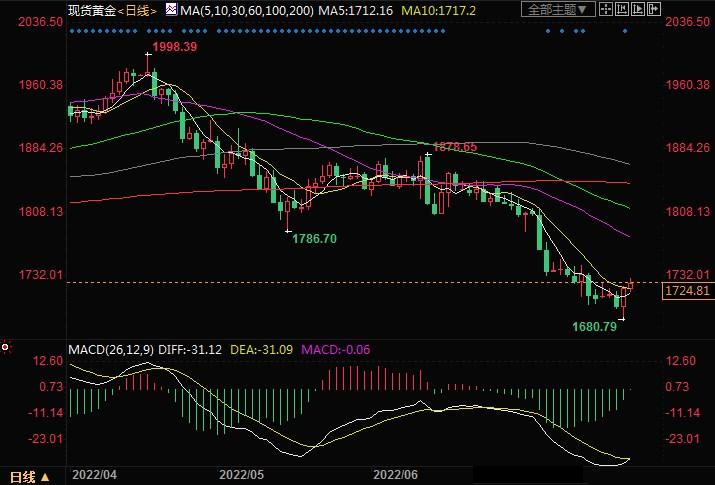本周现货黄金涨幅约1.03%,这是金价连续五周下跌后录得的首周上涨。本周上涨约18美元/盎司,振幅2.63%,高点低点相差约45美元,低点1680.79美元/盎司,刷新了16个月以来的新低。其中周四周五录得涨幅,周四涨幅最大为1.30%。本周金价触及低点后上行调整,回到1700美元上方。相应地,本周美元指数在连续上涨三周后录得首周下跌,跌幅约0.76%,低点为106.3637。上周美元指数触及2003年以来的高点至109.3032。