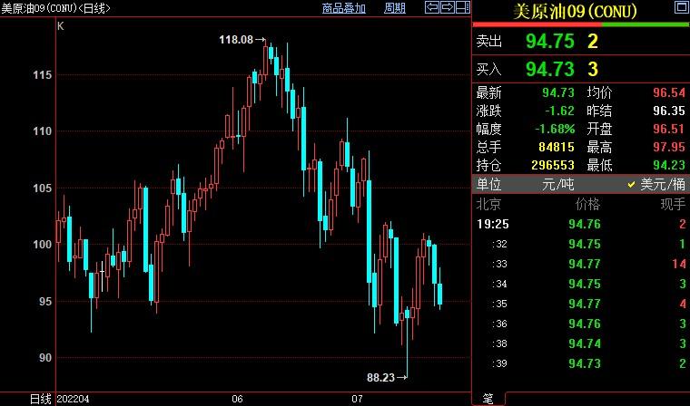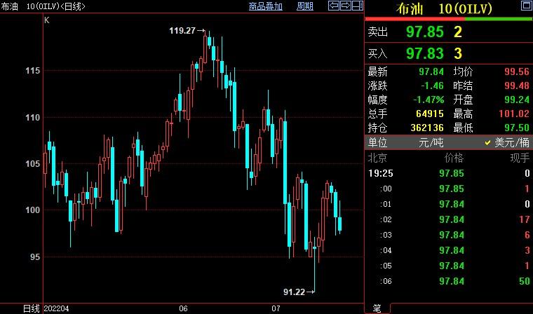 截至发稿,NYMEX原油期货9月合约上涨0.34%至94.70美元/桶;ICE布伦特原油期货10月合约上涨0.81%至97.83美元/桶。远离两市盘中触及一周高位,分别为100.99美元/桶和103.17美元/桶。