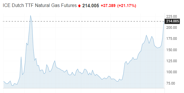全球天然气暴涨。荷兰TTF天然气期货价格现报214.005欧元/兆瓦时,涨幅超21%。欧洲天然气期货收涨20%,逼近2240美元/千立方米。英国第二日交付的天然气批发价格上涨28%,达到329便士/撒姆。美国天然气期货价格盘中一度涨至2008年以来的高位,至每百万英热单位9.75美元,为2008年7月以来的最高水平,尾盘回吐大部分涨幅。