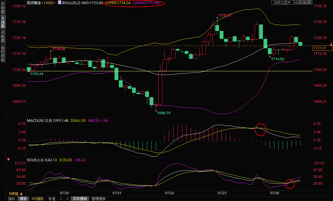 2小时级别:震荡;MACD死叉,KDJ轻微金叉,布林线轨道收口后接近水平运行,短线走势变数较大,留意布林线轨道1712.67-1734.54区域突破情况。
