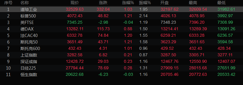 美股收盘情况, 道琼斯工业指数上涨1.03%,至32,529.63点;标普500指数上涨1.21%,至4072.43点;纳斯达克指数上涨1.08%,至12162.59点。