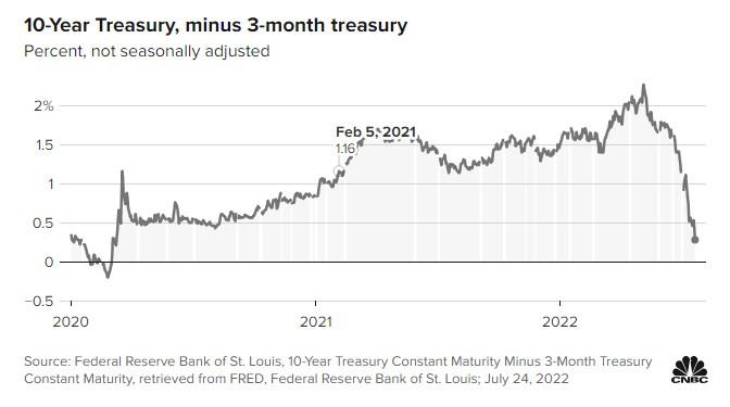 金融市场,尤其是固定收益市场,仍然指向衰退。两年期美国国债收益率在7月初升至十年期美国国债之上,此后一直保持在这一水平。这种被称为反向收益率曲线的走势,几十年来一直是一个可靠的衰退指标。不过,美联储更密切地关注十年期和三个月期国债收益率之间的关系。下图为美国十年期国债收益率与三个月期国债收益率差值的曲线图,这条曲线尚未反转,但截至7月22日上周五收盘,在这条曲线上显示为0.28个百分点,貌似正以陡峭的角度急速向下方横轴坠落,而2020年3月4日以后均高于0.28。