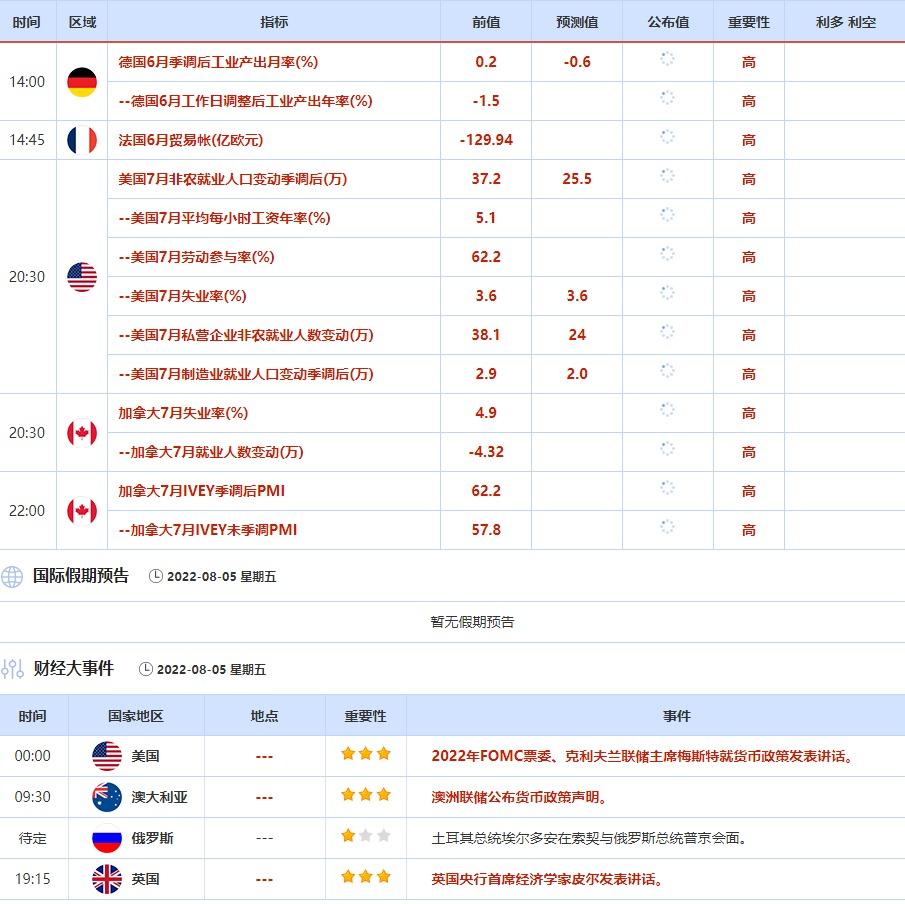 ⑤8月5日(周五)关键字:美国7月非农和失业率,克利夫兰联储主席梅斯特