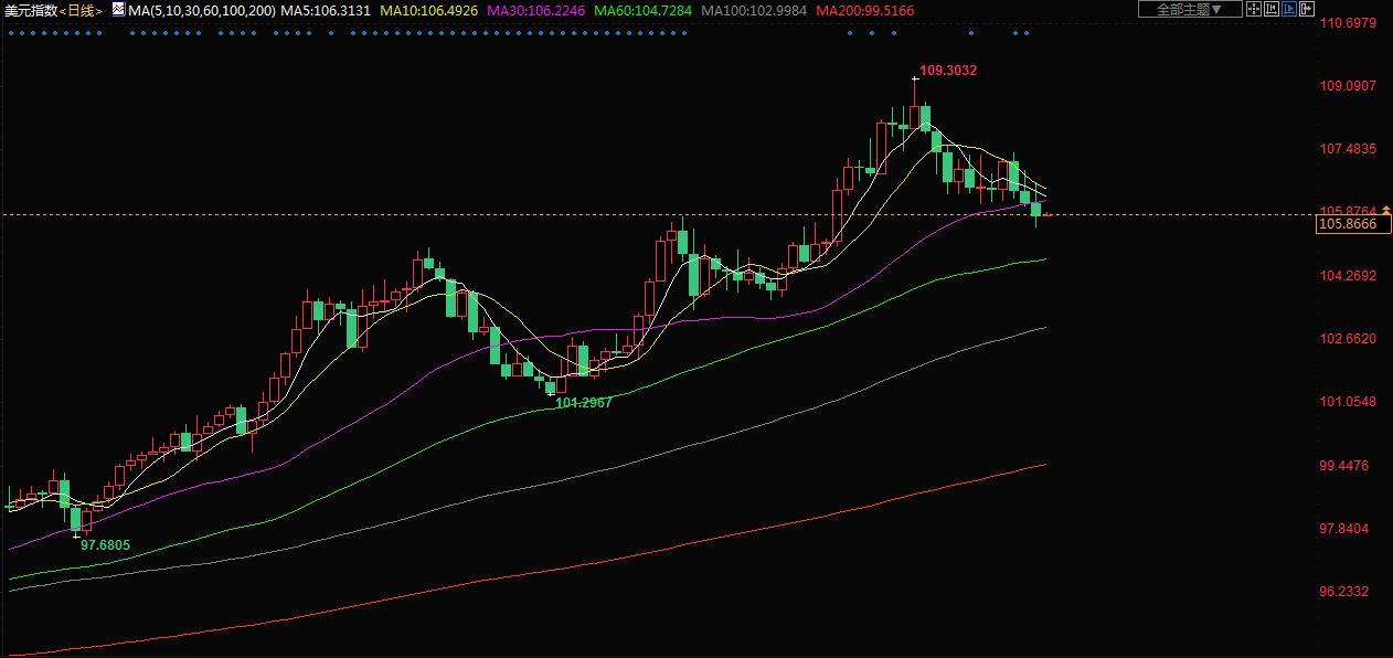 美联储主席鲍威尔上个月曾提到密西根大学消费者信心数据是转向更激进利率政策背后的关键。Action Economics的数据显示,芝加哥制造业指数降至23个月新低52.1,刷新之前56.0的最低纪录,这也给美元造成部分拖累。午后交易中,美元指数下跌0.3%,至105.89,稍早触及三周最低的105.53。
