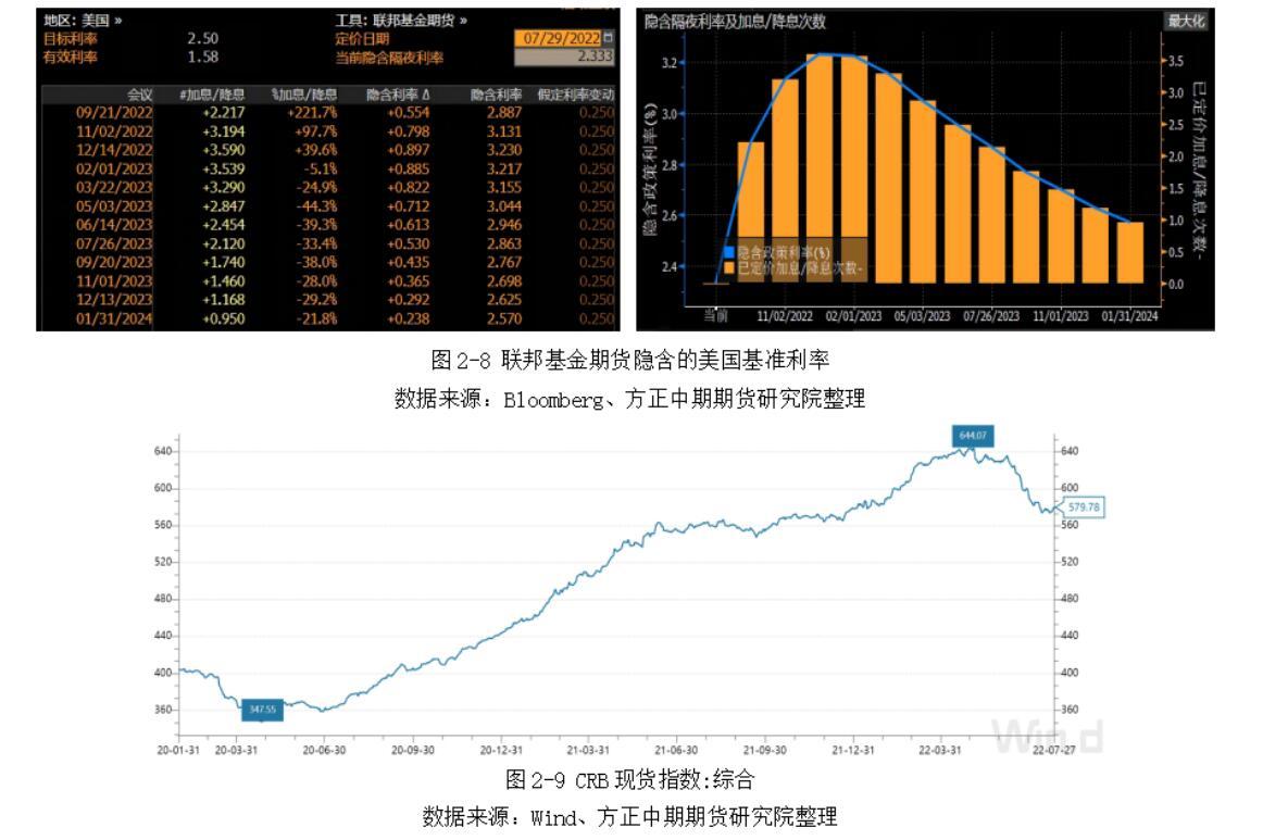 CRB现货综合指数在5月4日出现拐点,美国通胀水平在下半年将震荡回落,同时美国经济下行压力不断加剧,美联储大概率将在下半年放缓加息节奏,有可能出现“9月50BP、11月25BP、12月25BP”的加息路径。联邦基金期货显示明年1月美联储就将进入下降通道。