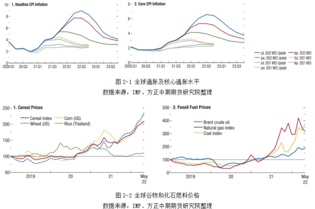 受到粮食危机、能源危机和能源危机的影响,导致粮食和化石燃料供应短缺,引发全球性通胀。全球通胀的实际水平和预期都在不断抬升,预计今年发达经济体的通胀率将达到6.6%,新兴市场和发展中经济体的通胀率将达到9.5%,分别上调0.9和0.8个百分点。今年三季度全球通胀率有可能达到9%左右的峰值,后期随着各国央行加速货币收紧步伐、经济下滑致需求回落以及高基数影响,今年四季度起通胀水平将会明显回落。