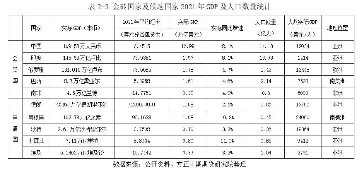 加入金砖国家组织有三条不成文的规定:其一,必须是发展中国家;其次,国家属于区域大国,在领土、人口、经济等各方面均有较强的区域影响力;第三,非西方阵营。此次申请加入金砖国家机制的五国基本符合这样的要求,并且有极强的经济互补功能。沙特和伊朗都是中东大国,盛产石油,可以满足中国和印度对于石油的巨大需求。土耳其横跨欧亚大陆,战略地位十分重要,政治、经济、文化、军事方面在中东和东欧地区有着举足轻重的地位。阿根廷和埃及均为南美洲和非洲的第二大经济体,拥有丰富的粮食和矿产资源。中国和印度是全球重要的制造业中心,可以为其他金砖国家提供各类商品。一旦五国全部进入,金砖国家的成员数量将达到10个,人口规模超越35亿,接近全球一半,从而进一步提升发展中国家的影响力,完善新兴经济体的产业链。