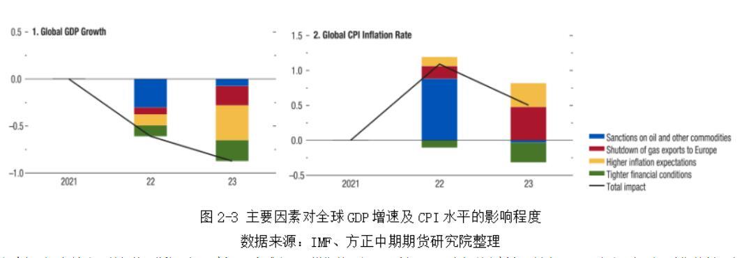 当前引发全球经济下行以及通胀高企的原因有很多,IMF选取其中核心因子,以量化分析为基础,做了全球经济进一步下行的压力测试。其一,假设俄罗斯从今年下半年额外再减产石油20%,将使得2022-2023年全球GDP分别下降0.4和0.15个百分点,同时将今年全球CPI水平再提升0.8个百分点。其二,倘若俄罗斯在今年年底前将彻底断供欧洲的天然气,无论俄罗斯主动断供还是欧盟对俄采取制裁措施,将使今明两年全球经济增速分别下调0.1和0.35个百分点,同时又会使全球通胀水平分别上调0.25和0.4个百分点。其三,更加收紧的货币政策也将进一步影响全球经济增速,但会放缓全球通胀率。这些极端因素叠加将使2022-2023年全球经济增速预期进一步下滑至2.6和2%。