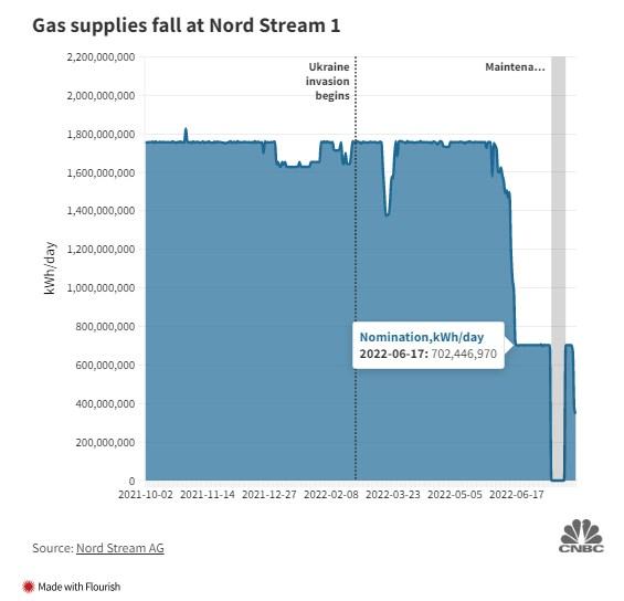 仅在上周,通过北溪1号管道的天然气供应就从40%下降到了20%,原因是Gazprom提出了维护问题。德国经济部长Robert Habeck说,Gazprom的技术借口是一场“闹剧”。在最近一次减少供应前,供应曾短暂停止,维修工程已于7月11日至7月21日期间完成。